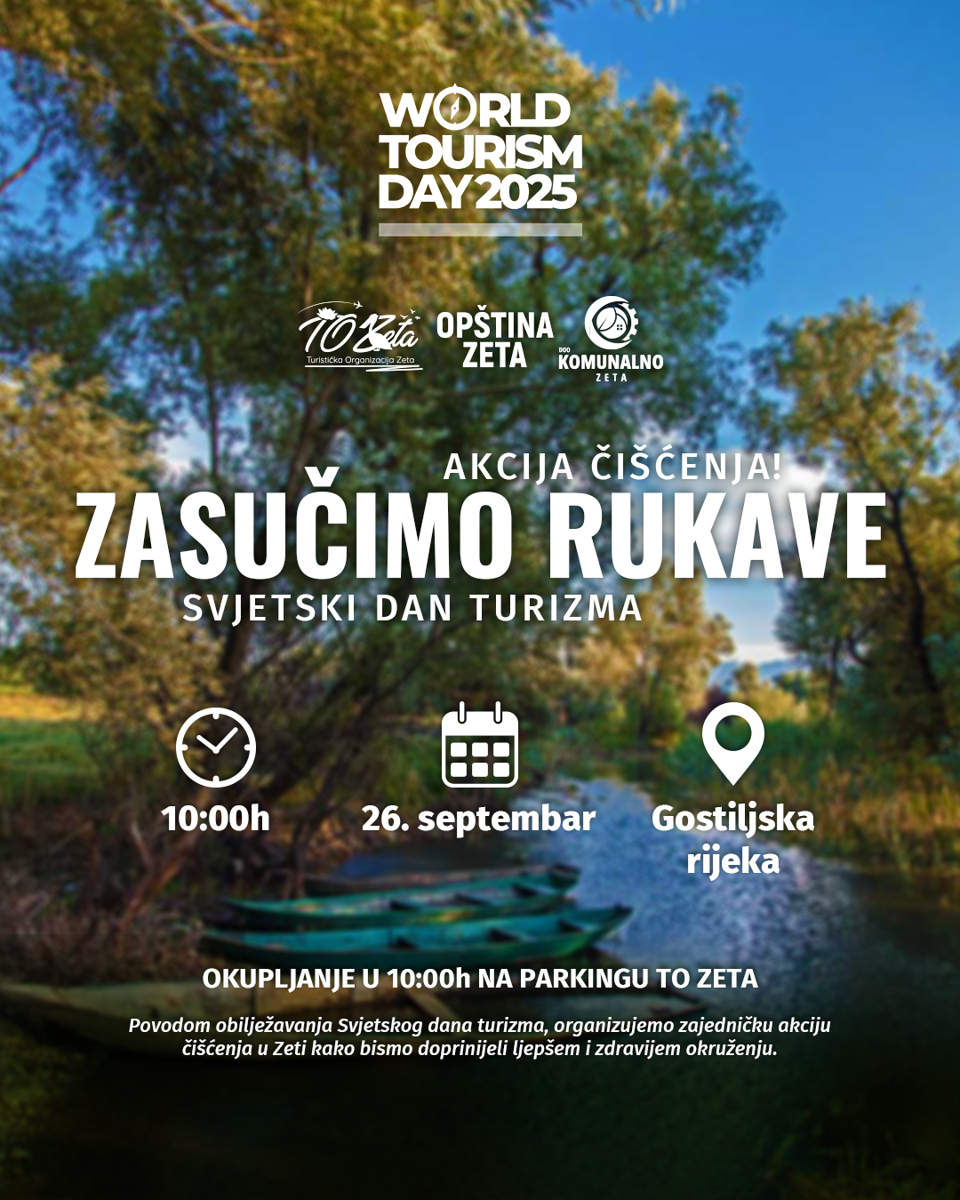 On the occasion of World Tourism Day, TO Zeta, in cooperation with PUC "Zeta" doo, is organizing a cleaning campaign under the slogan "Let's roll up our sleeves". Location - Gostiljska River Time - 10:00 AM Meeting point - Parking lot of TO Zeta We invite all fellow citizens, associations and nature lovers to join us in this campaign and together contribute to a more beautiful and healthier environment.Continue reading “Akcija čišćenja ”Zasučimo rukave””