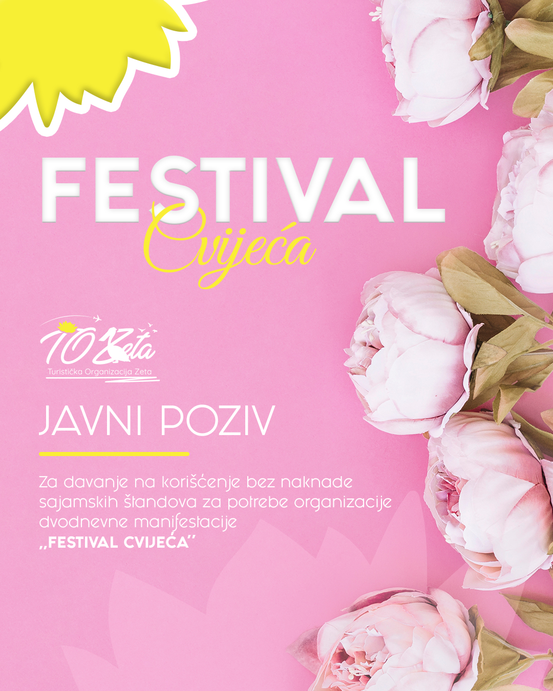 Turistička organizacija opštine Zeta objavila je Javni poziv za davanje na korišćenje bez naknade sajamskih štandova za potrebe dvodnevne manifestacije ”Festival cvijeća” , koja će se održati 7. i 8. marta 2026. godine na Trgu Anovi u Golubovcima. Pravo učešća imaju zainteresovana pravna i fizička lica sa teritorije Opštine Zeta. 📌 Link javnog poziva iNastavite čitati “Festival cvijeća”